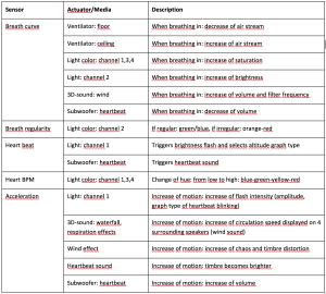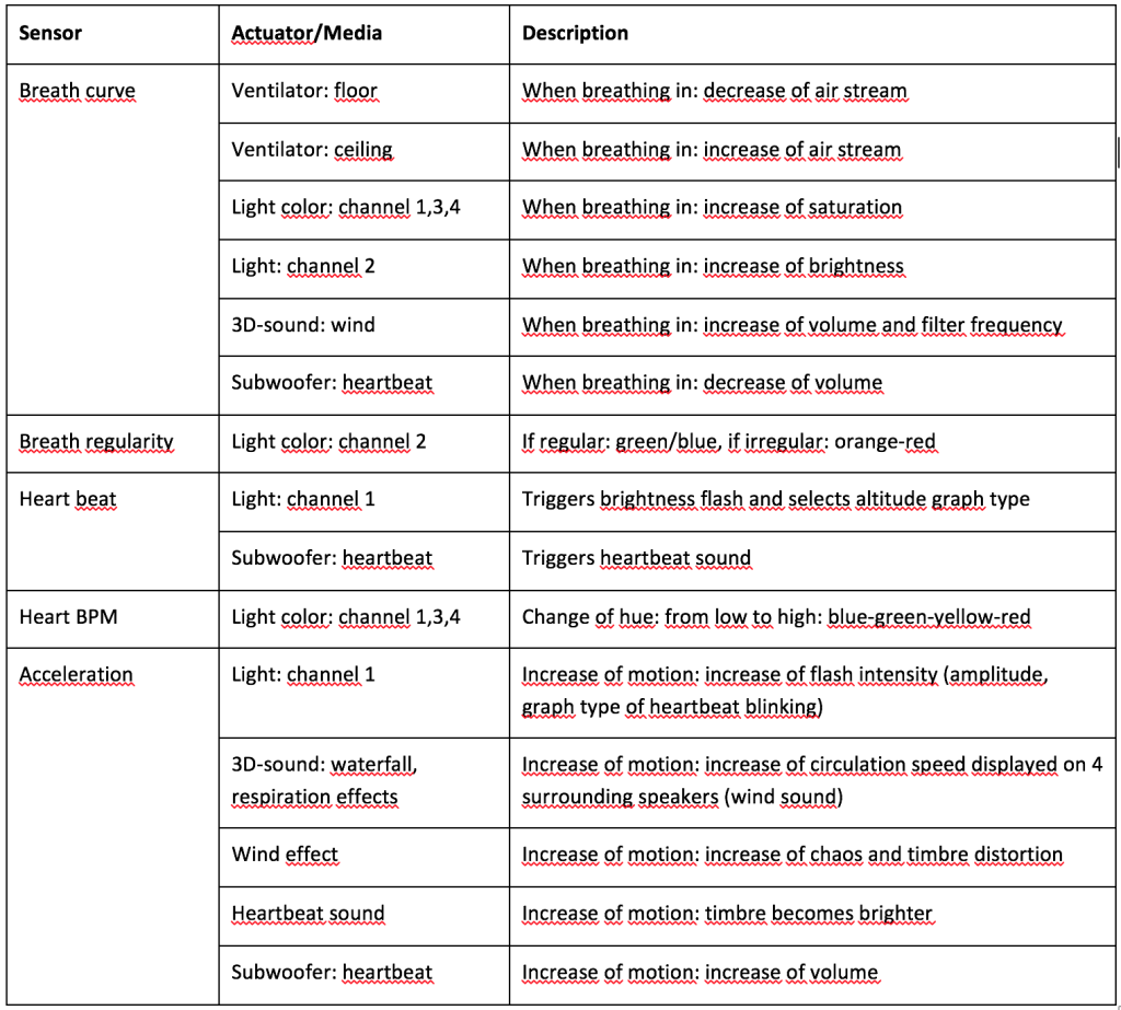 The table on the right gives an overview of the fully controllable sensor-actuator mapping design of the installation. Different types of information can be processed and interpreted from one single biofeedback signal and different parameters of different actuators can change accordingly. To create an atmosphere that can be perceived as emotionally responsive, we developed a complex setting of composed couplings departing from metaphors of the physical world, western media literacy or studies as for example color psychology.