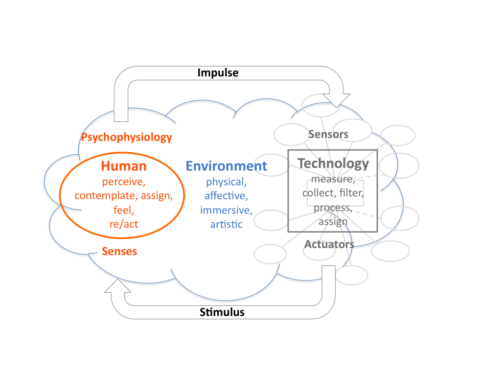 We combine ubicomp and biofeedback technologies to immediately and affectively connect and relate an artistic responsive environment with a visitor. By doing this we consider both sides – the human and the technological system – as equal actors that are connected and interplay in real-time in a human-in-the-loop system (Fig. 1). Although the technical system has no independent intelligence and currently forms a simple feedback loop, its physical responses follow dynamic mappings to physiologic human reactions, manifested through light, sound and wind. These responses are expressive and can cause new physiologic reactions, creating a human-machine interdependency.