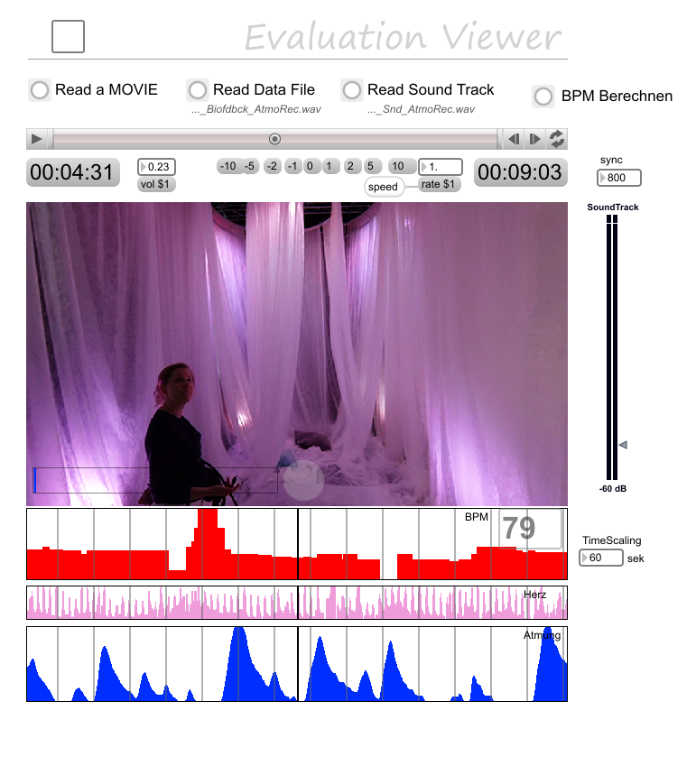 We record the measured bio-physiological sensor data. The sensor recordings are merged with the video and audio track of a recording of a visitor in the Evaluation Viewer (Fig. 2). This allows us to analyze the recorded behavior together with the appearance and sound of the installation at a glance.